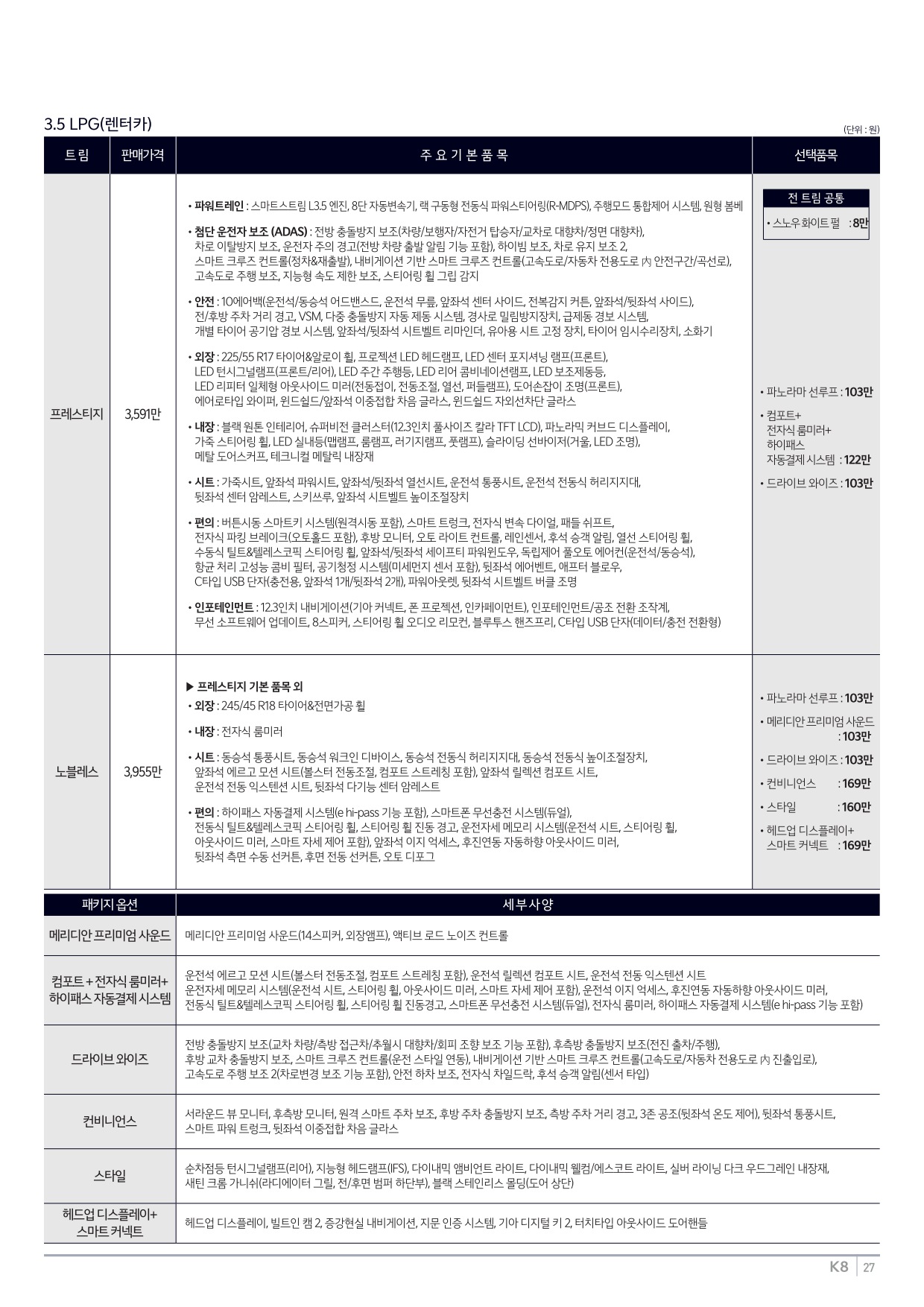 2.5 가솔린은 정숙한 자연흡기 성격과 합리적인 구매비로 K8 라인업의 볼륨을 담당한다. 노블레스 라이트만 선택해도 차로·전방·후측방 보조와 12.3인치 디스플레이 조합, 스마트키 원격 시동, LED 램프류가 포함돼 패밀리 세단으로 모자람이 없다. 베스트 셀렉션은 주차 보조와 후측방 모니터, 테마 확장형 인테리어 요소가 더해져 출퇴근과 주말 주행에서 체감 가치가 높다.