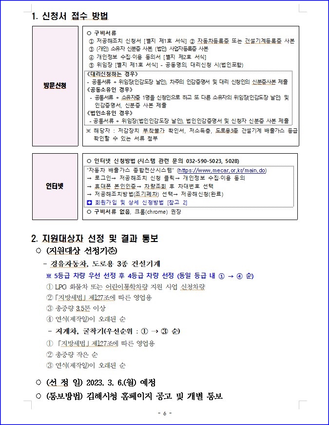올해 김해시조기폐차 노후경유차 지원사업은 2월6일부터 2월17일 까지 접수를 받아